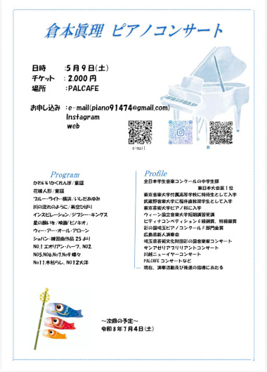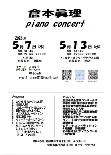 ◇教念寺門信徒の倉本眞理さんが、ピアノ・コンサートを開かれます。 皆様お誘いあわせのうえご鑑賞ください。